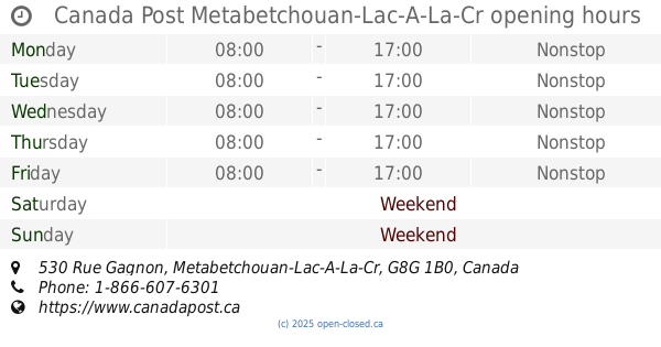 It is also possible to : Edit these OPENING HOURS of Branch Canada Post In Metabetchouan-Lac-A-La-Cr, 530 Rue Gagnon,